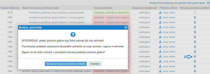 | Status podataka | Odabir mogućnosti u svezi izmjene podataka poslovne godine (temeljnica i knjiženja). Ukoliko je poslovna godina arhivirana naknadne izmjene nisu moguće. |