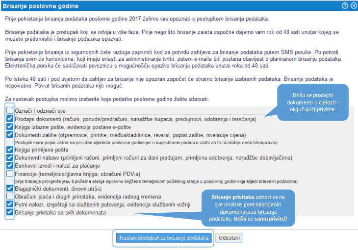 Prije izvoza podataka izabrati možemo poslovnu godinu za koju želimo izvoziti podatke i jezičnu varijantu te označiti koje podatke tj. dokumente želimo izvoziti. Obradu pokrenemo klikom na gumb , kao što prikazuje slika: